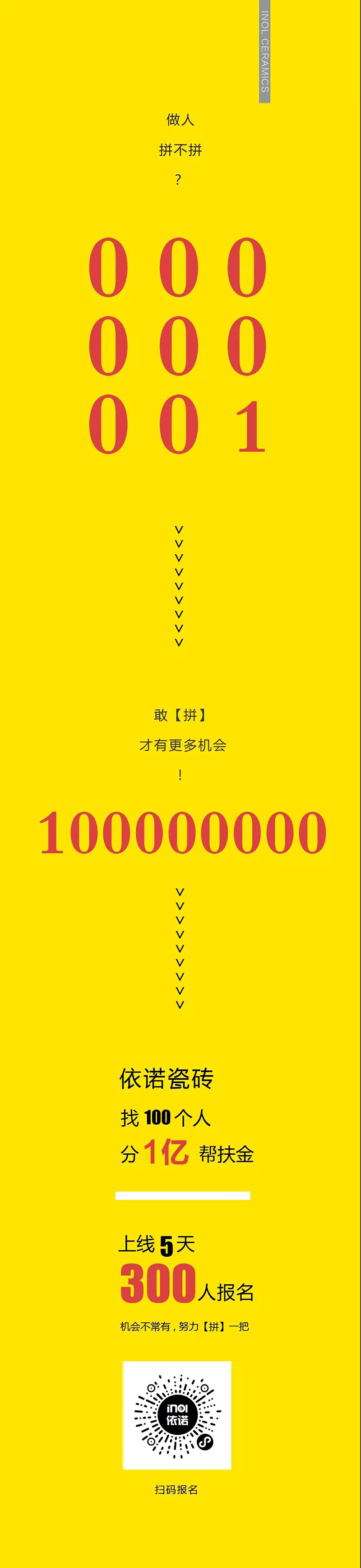敢【拼】,才有更多機(jī)會(huì)!依諾瓷磚20周年慶,招商加盟找100個(gè)人分1億幫扶金,上線5天300人報(bào)名,機(jī)會(huì)不常有,努力【拼】一把