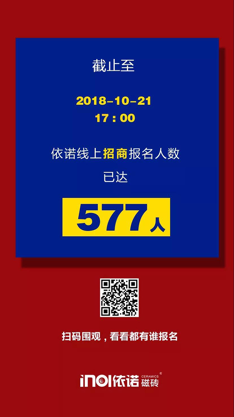 本屆陶博會(huì),依諾瓷磚品牌憑借【100人分1個(gè)億】的招商加盟政策刷屏陶瓷圈。截止10月21日,下午17:00,依諾瓷磚品牌線上【招商小程序】報(bào)名人數(shù)已達(dá)577人,且其中超過90%的經(jīng)銷商已經(jīng)在陶博會(huì)期間前往依諾瓷磚總部展廳進(jìn)行深入洽談。