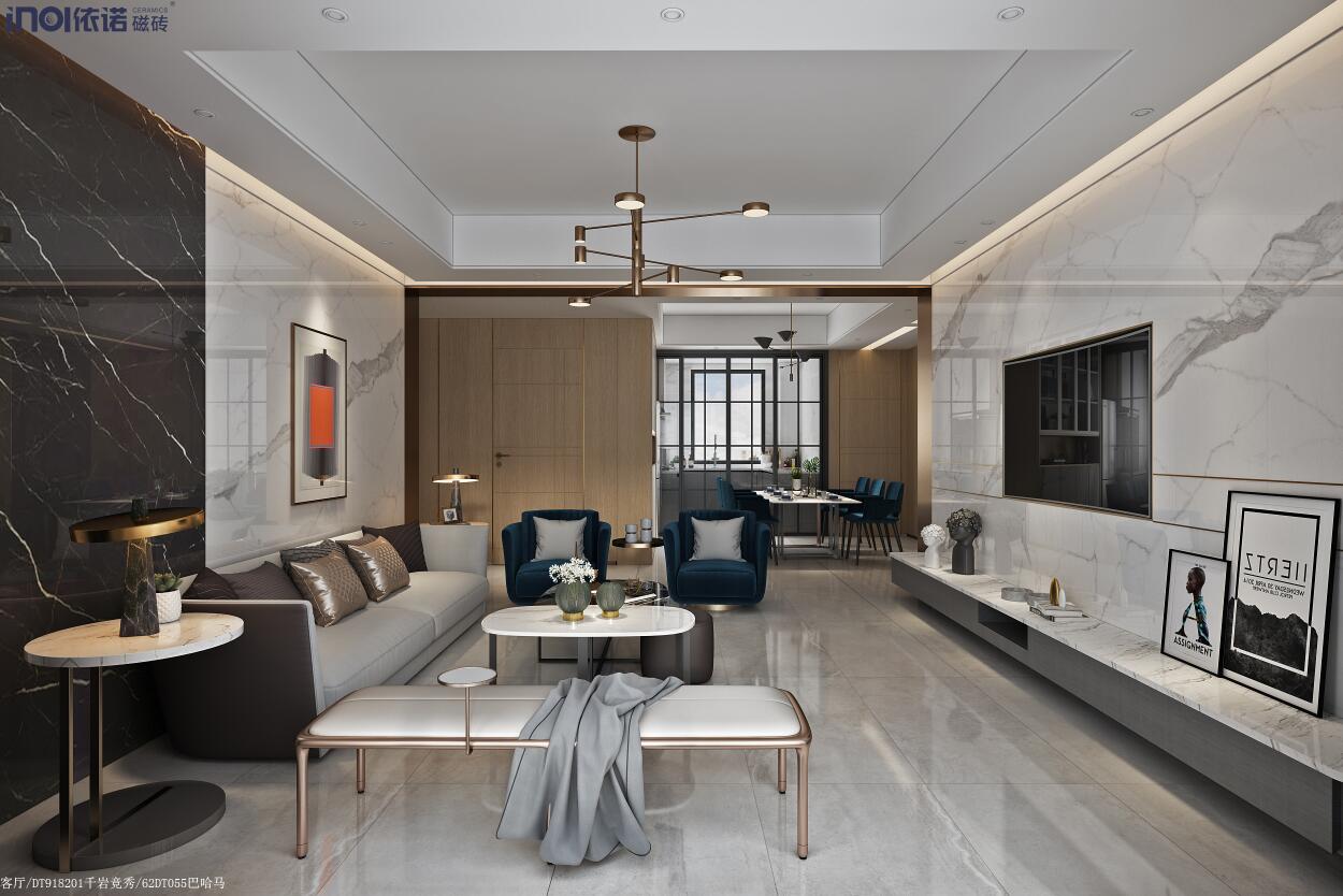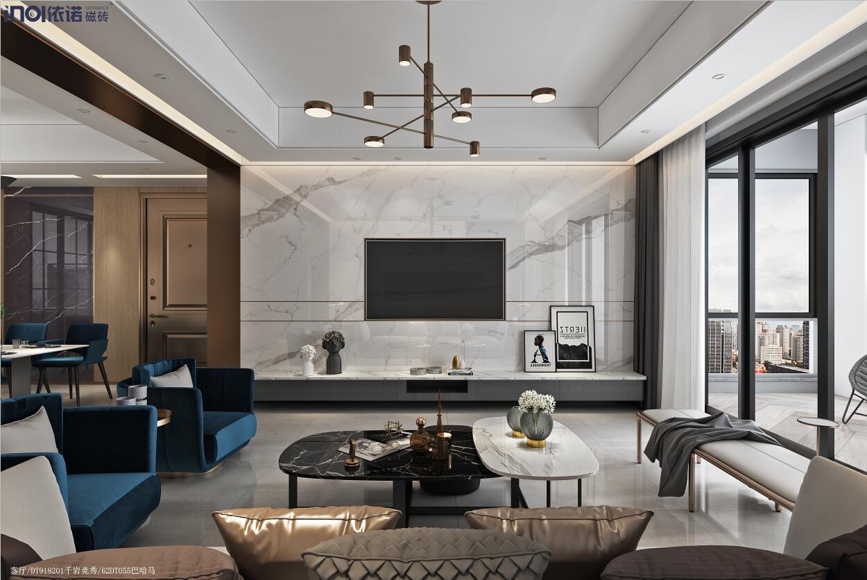 地面采用了依諾瓷磚【通體大理石】巴哈馬系列,畫面設計靈感來源于天然海灘紋理,溫和的淺灰色調,搭配同色系沙發(fā),點綴金屬材質,借由藍色絲絨沙發(fā)的融入,撩撥出一分活潑生動,現代與閑適并存。