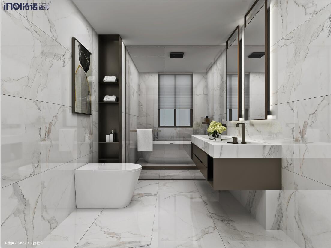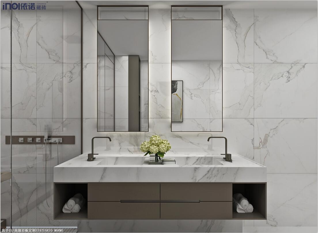 墻地均采用了依諾瓷磚【通體大理石】卡拉拉白系列,通體潤澤,宛如純白雪域,紋理似絲絹般飄逸,散發(fā)出純潔高貴氣質,洗手臺為依諾【高級巖板定制】產品,整體空間呈現干凈、流暢的形態(tài)。