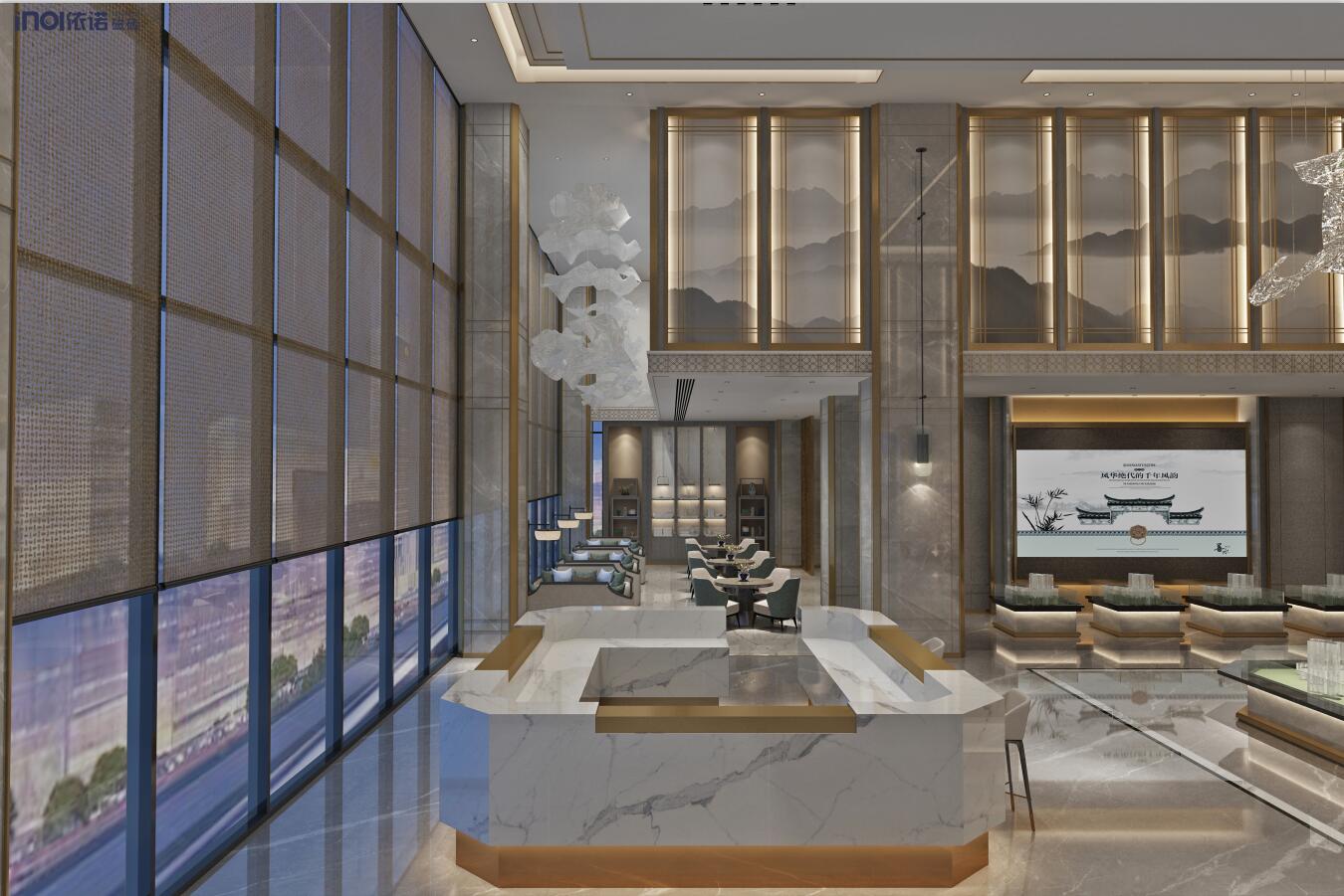 從沙盤大廳到接待區(qū),天花采用了挑高的設(shè)計手法,豁然開朗,中空墻身一側(cè)為山水水墨畫,另一側(cè)為依諾大理石瓷磚【連紋大板】千巖競秀系列,明凈的白色大理石紋,主次分明,精致簡約,增添了空間的柔和感。