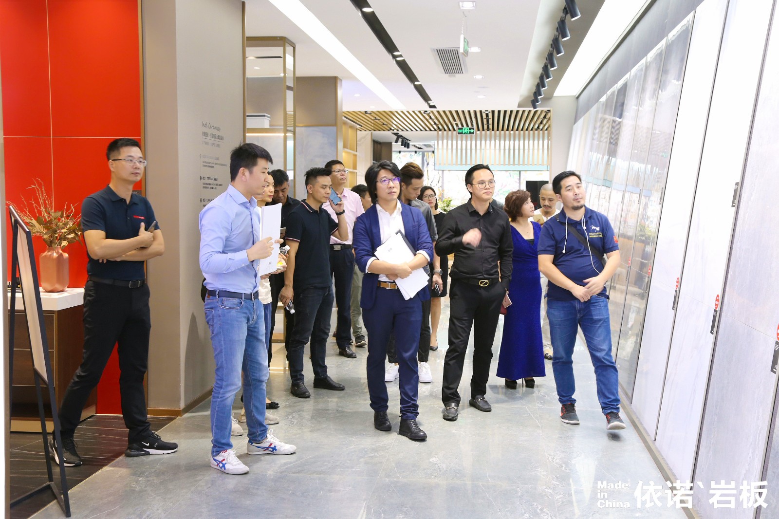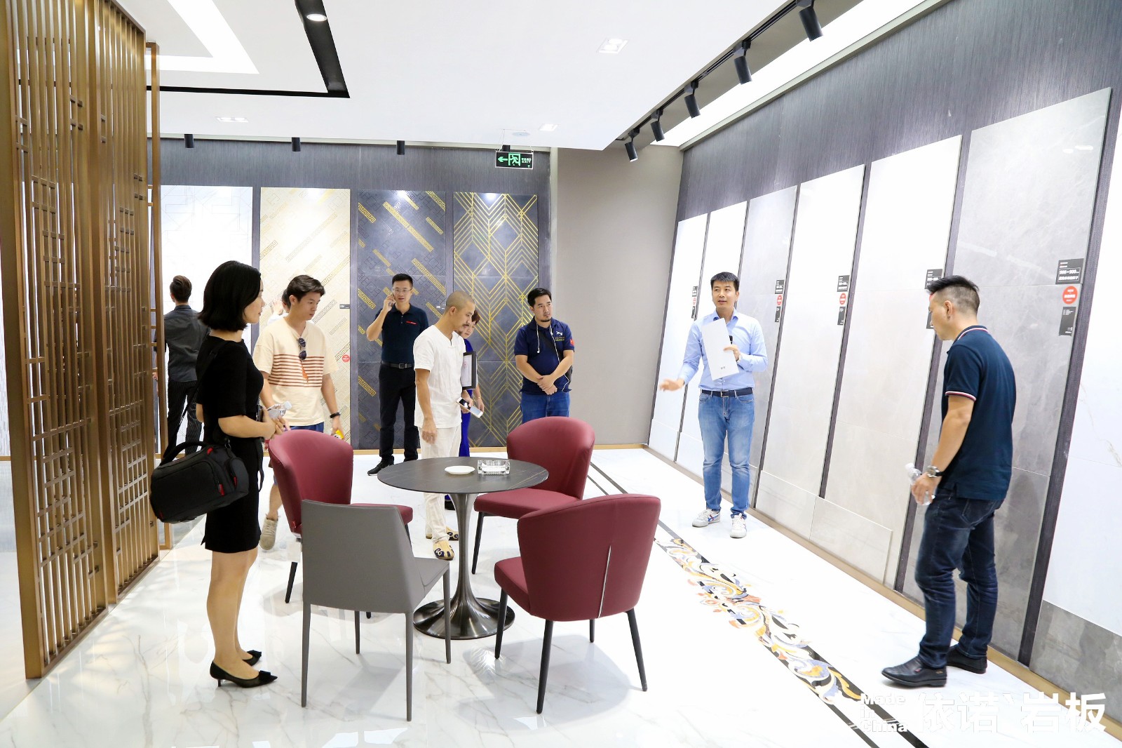 冼總為來賓們進行了品牌介紹,并重點講解了依諾巖板廠家,自主研發(fā)、設計和生產(chǎn)的高端新品【依諾巖板】,講述其定義、性能優(yōu)勢、花色、應用方式和未來發(fā)展空間?!疽乐Z巖板】在硬度、韌性、防污等多方面物理性能優(yōu)于普通瓷磚,高顏值,無甲醛,同時具有【抗沖擊、耐刮磨、不吸污、耐高溫】等優(yōu)良特性,是家居范疇的全新物種。