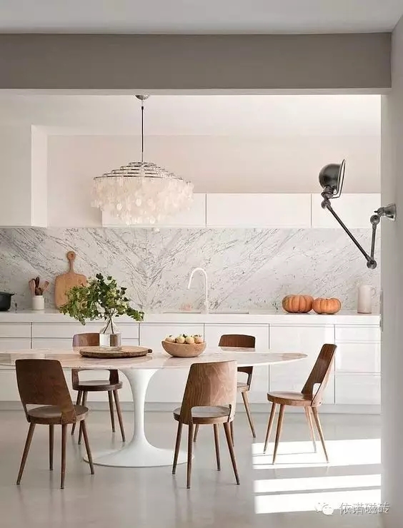 這一個(gè)使用了Carrara的空間,搭配原木色的家具和金屬的燈具,這個(gè)感覺,我想到的是瑞典室內(nèi)設(shè)計(jì)師 MarieOlsen Nylander,獨(dú)立、隨性、有思想、不做作的時(shí)髦,就是這樣。