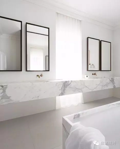 最后一張,大理石元素的洗手臺(tái)和浴缸,幾個(gè)黑色的鏡框畫龍點(diǎn)睛,黑白配是Carrara最經(jīng)典也是最保險(xiǎn)的做法,如果你實(shí)在不相信自己的軟裝功力,那么你就選黑白配一定不會(huì)錯(cuò),這個(gè)空間,超哥想到的是穿Alexander Wang的那些女孩兒,一臉大寫的“不要靠近”。