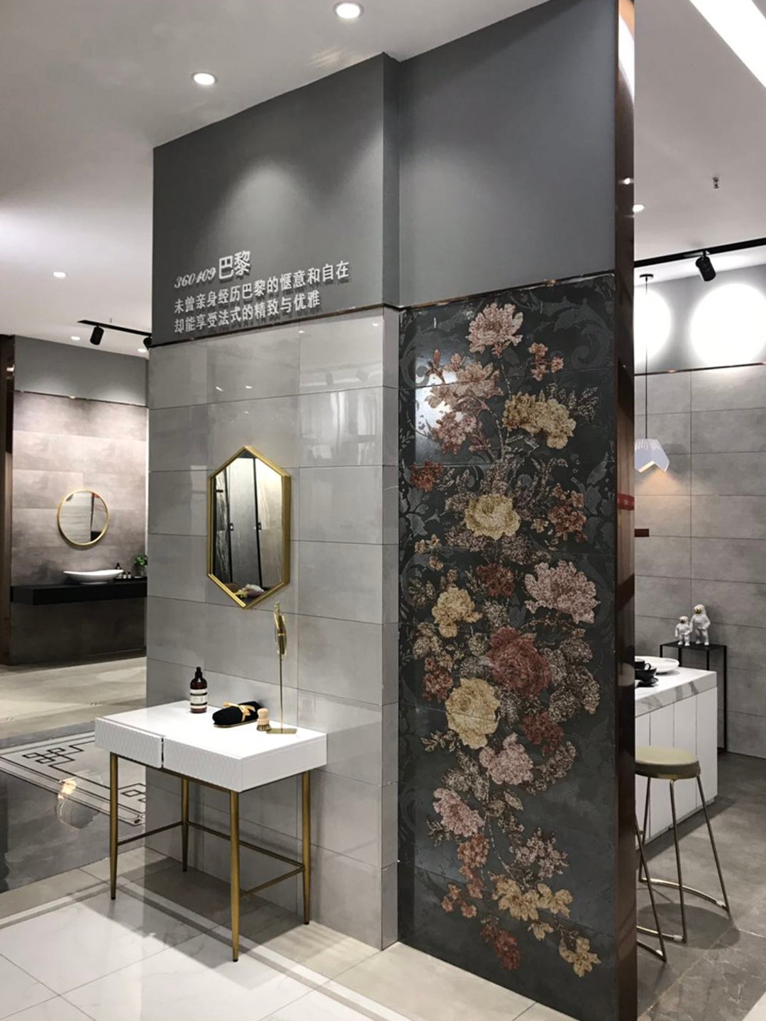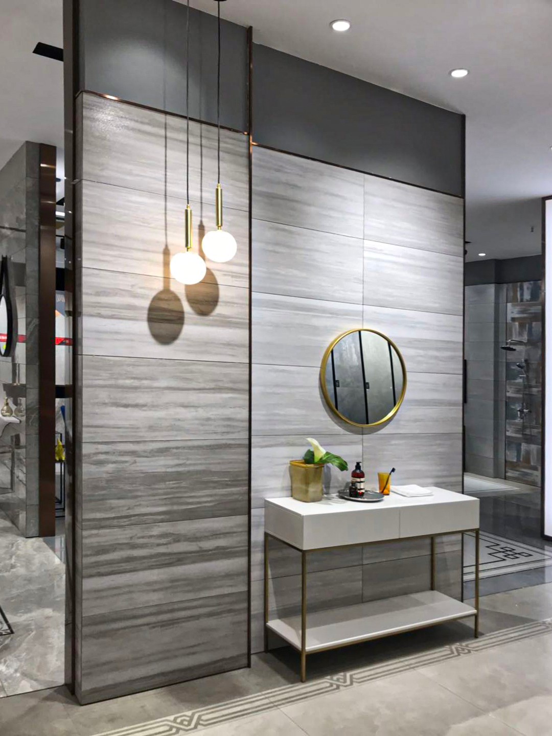 【依諾瓷磚·靖西店】以高級(jí)灰為主基調(diào),奠定了空間優(yōu)雅、沉穩(wěn)的氣質(zhì)。為了突出空間的高級(jí)質(zhì)感,店內(nèi)選擇了黃銅為主要輔材,精致、復(fù)古而富有光澤的材質(zhì)搭配大理石紋理的瓷磚產(chǎn)品,輕松打造一個(gè)精致的家居體驗(yàn)環(huán)境。