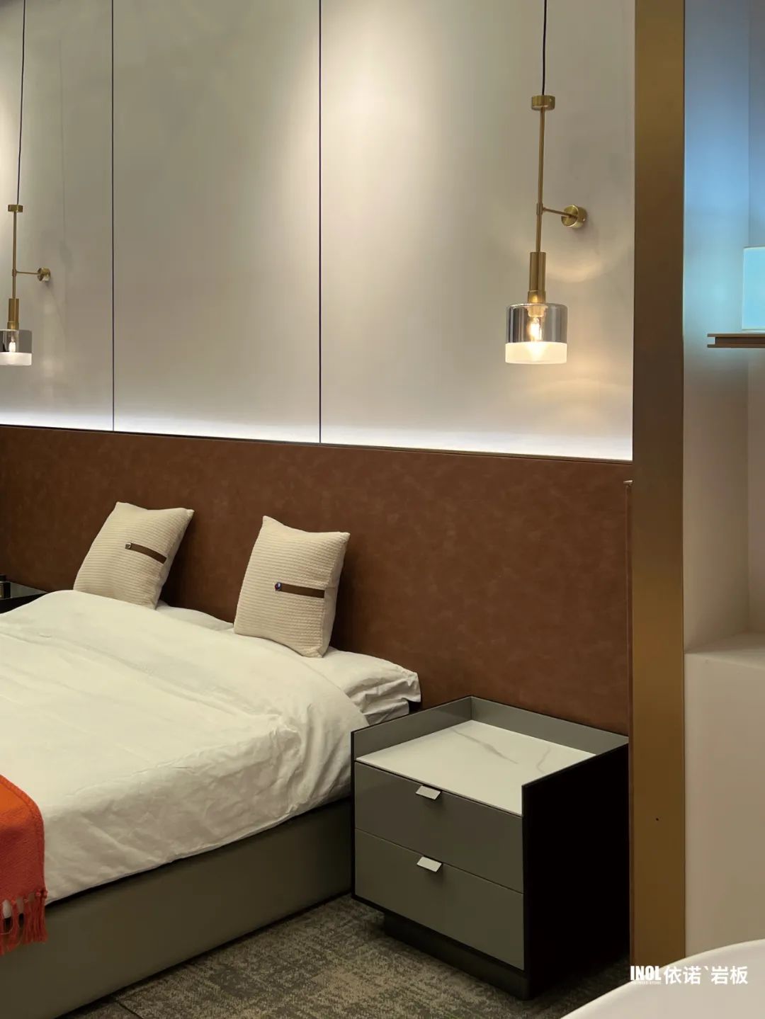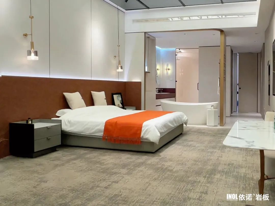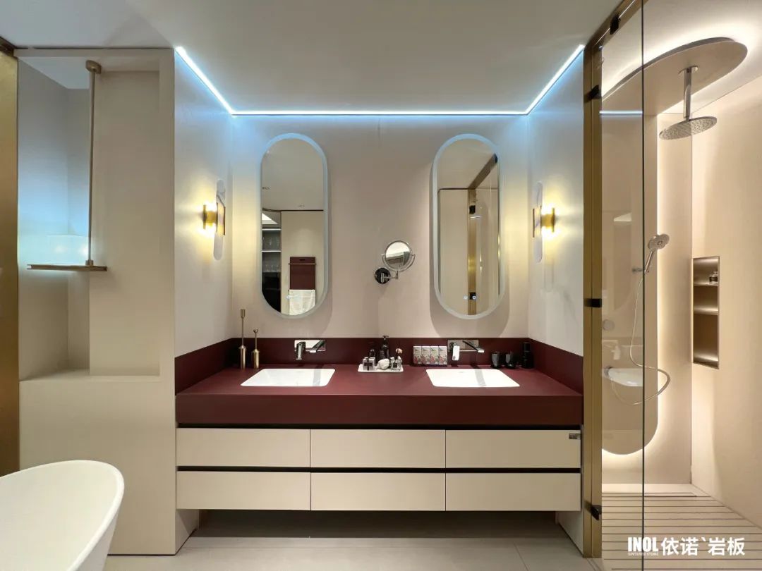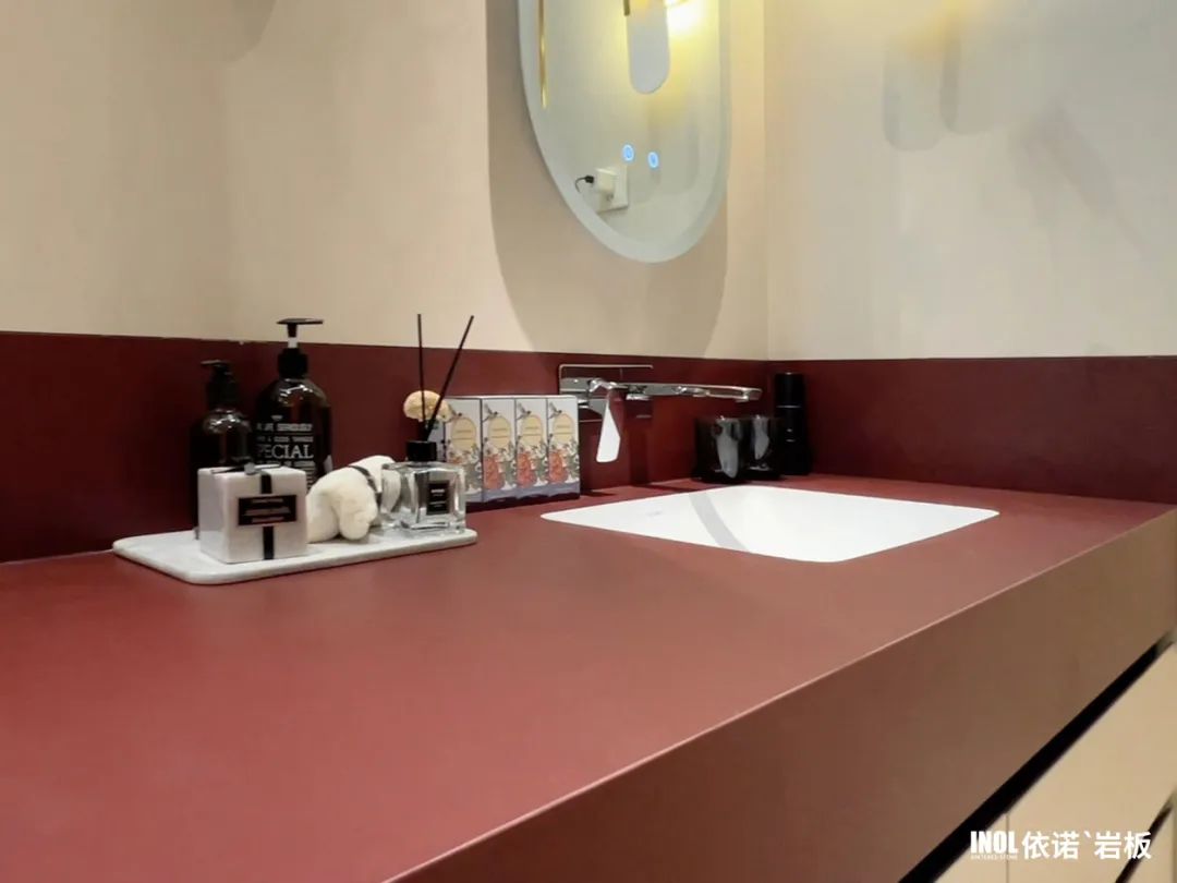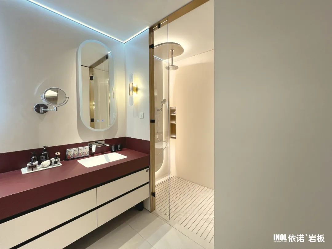 除了花色和規(guī)格多樣,依諾巖板實(shí)現(xiàn)了全厚度打通,配合巖板本身的優(yōu)越性能,在提升空間舒適度上起到出色的作用:例如3mm的超薄巖板用于客房門板、浴室柜柜門,不僅【自重輕】,開(kāi)合自如,而且足夠【靜】;6mm巖板用于墻面地面,0甲醛0氣味,既美觀又健康環(huán)保;12mm巖板用于浴室柜臺(tái)面,足夠堅(jiān)實(shí),防潮防霉。