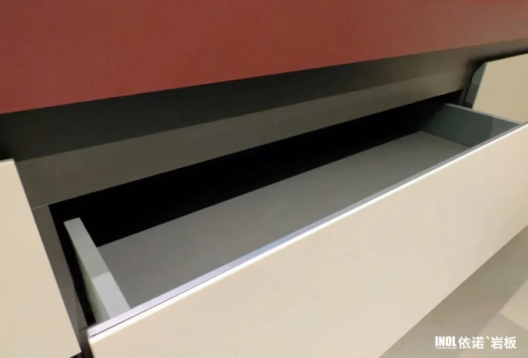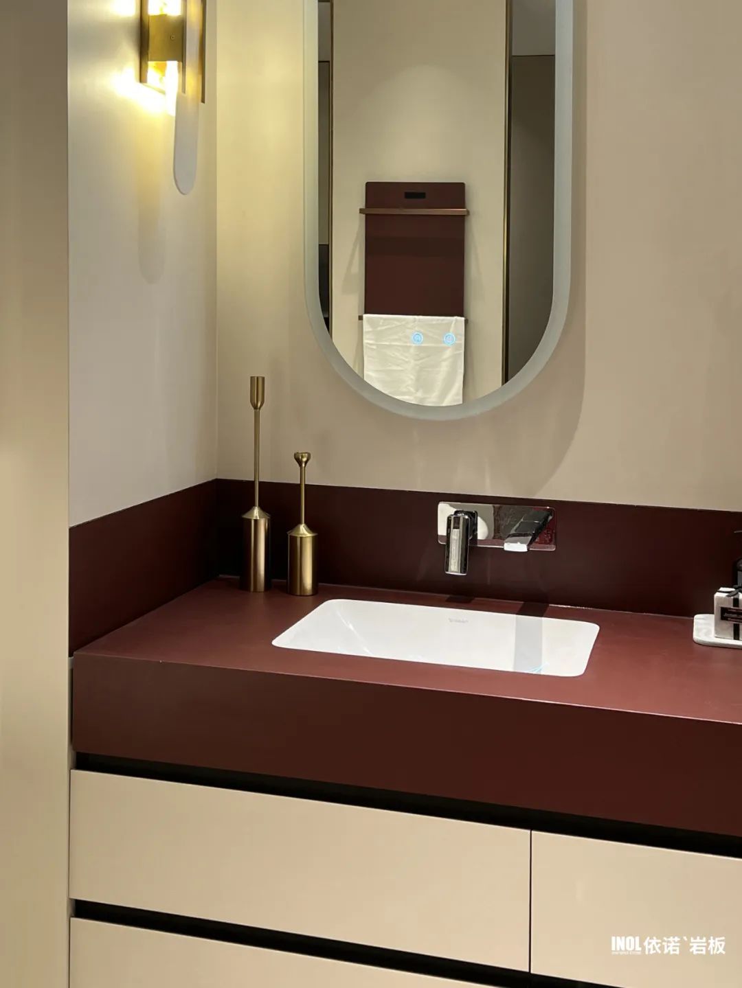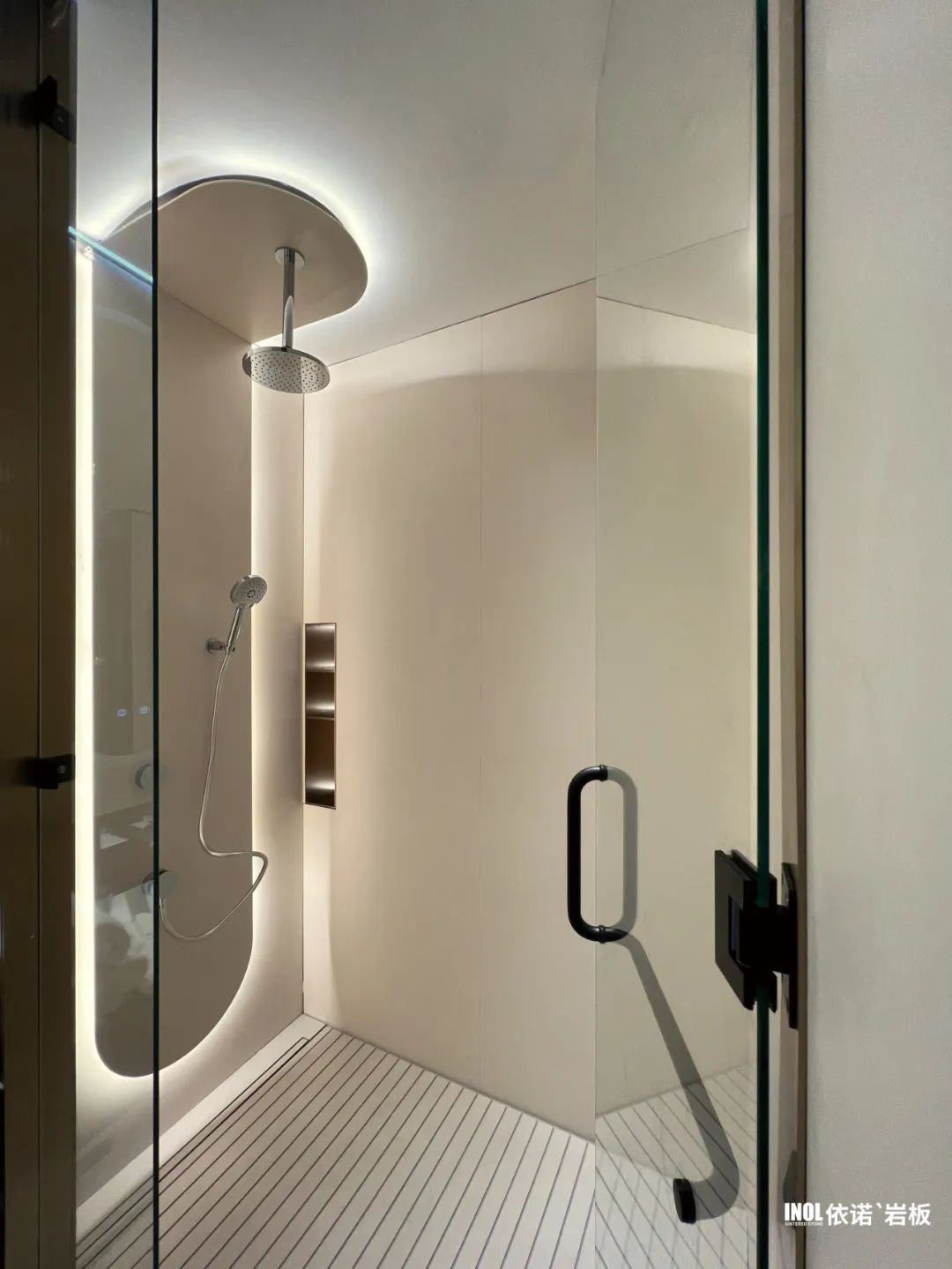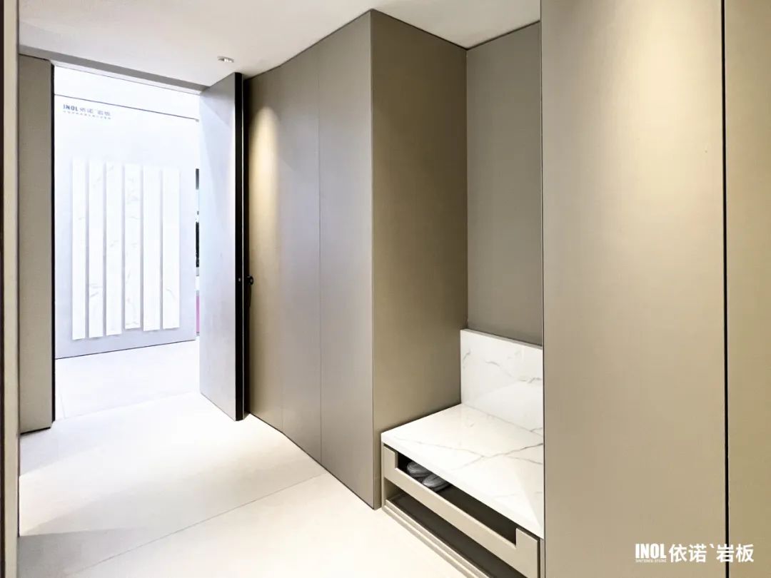 除了花色和規(guī)格多樣,依諾巖板實(shí)現(xiàn)了全厚度打通,配合巖板本身的優(yōu)越性能,在提升空間舒適度上起到出色的作用:例如3mm的超薄巖板用于客房門板、浴室柜柜門,不僅【自重輕】,開(kāi)合自如,而且足夠【靜】;6mm巖板用于墻面地面,0甲醛0氣味,既美觀又健康環(huán)保;12mm巖板用于浴室柜臺(tái)面,足夠堅(jiān)實(shí),防潮防霉。