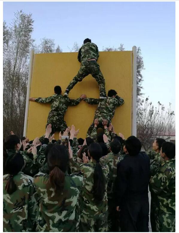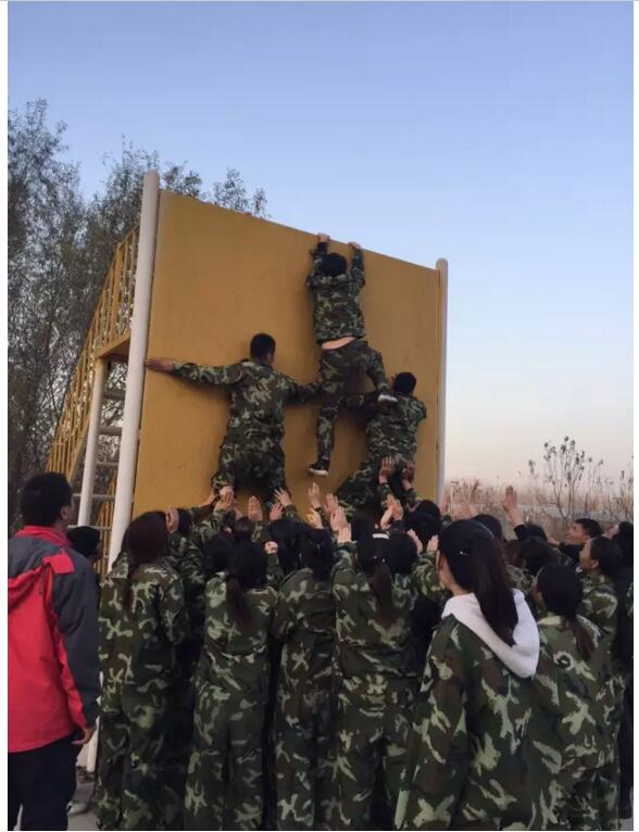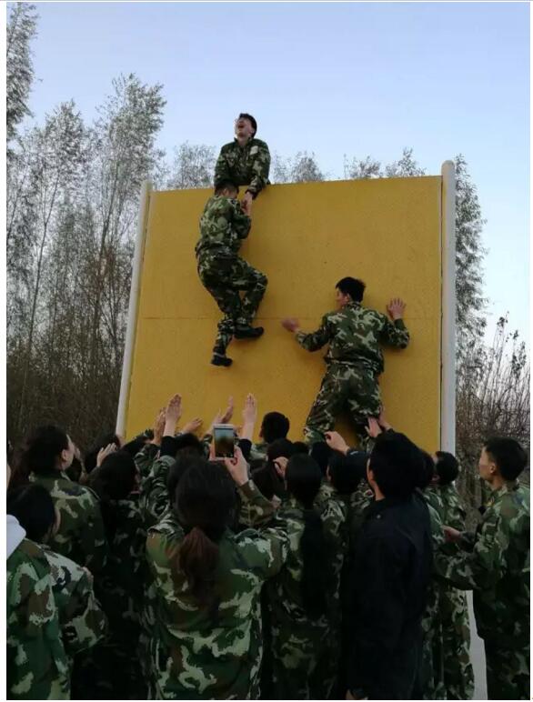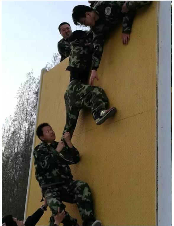 ▲齊心協力,突破難關。這是最富挑戰(zhàn)的一個項目,為了完成這項任務,所有隊員都目標一致,將自己的身體作為團隊伙伴的攀墻基石,用自己的雙手撐起一張厚實堅強的保護網……