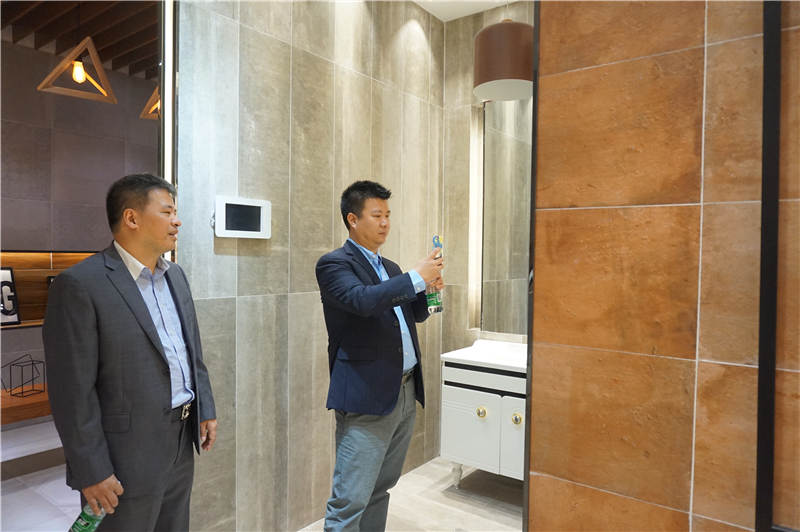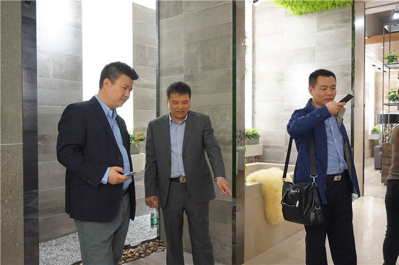△在依諾企業(yè)總經(jīng)理郭萬龍先生的帶領下,尚高衛(wèi)浴董事長曹宇勇一行參觀考察了依諾佛山總部展廳