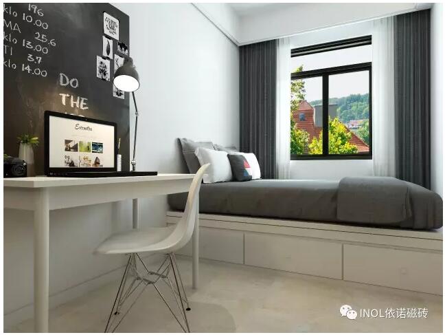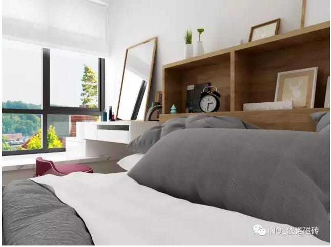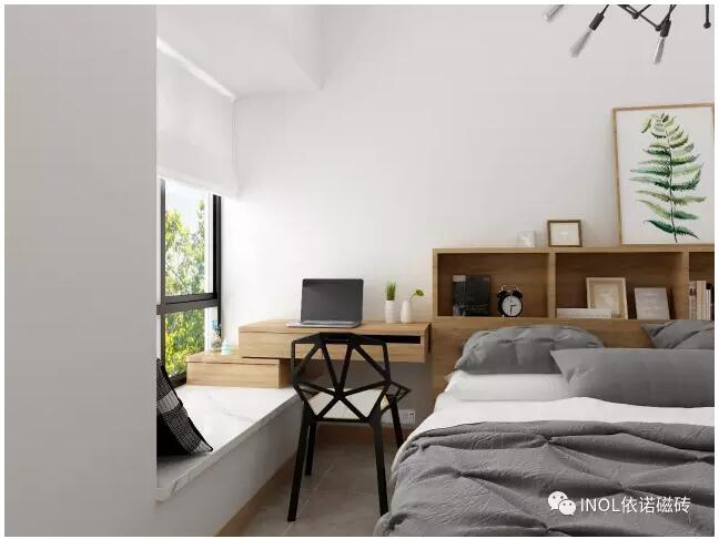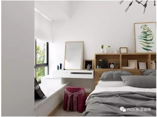 定制一個(gè)有儲(chǔ)物功能的床靠。再把飄窗利用起來,得到一個(gè)工作區(qū)。當(dāng)然也可以做成梳妝臺(tái)。