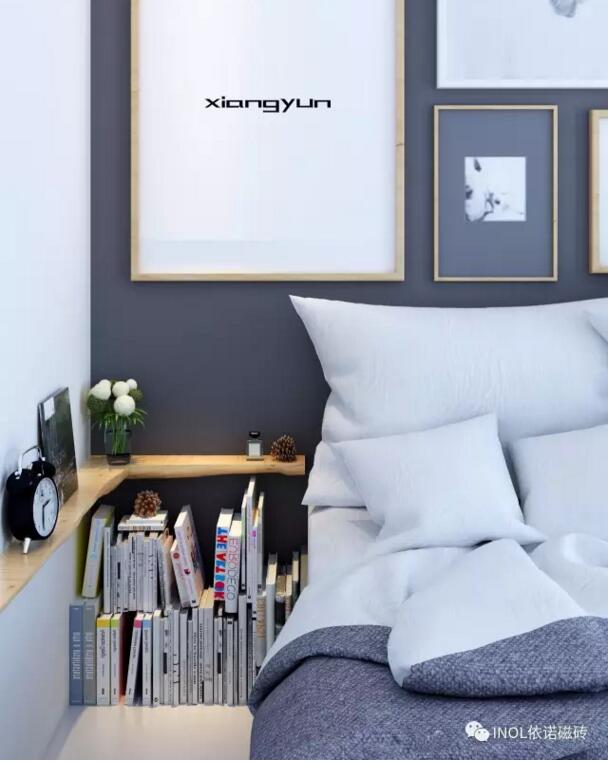 我喜歡閱讀,經(jīng)常在床上看書看到睡著;如果有這樣一個(gè)小閱讀角,看完書隨手一放,會(huì)是何等的精彩?所以我把這個(gè)想法做成了圖片:利用床頭位置做一個(gè)閱讀角,配上窄小的原木擱板,既能收納置物也能為空間的調(diào)性加分。
