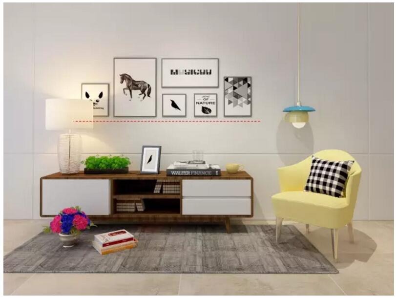 b. 根據(jù)屋主身高為參考,畫的中心在屋主雙眼平視高度再往上100~250mm為宜,這個高度不用抬頭或低頭,是最舒適的看畫高度;