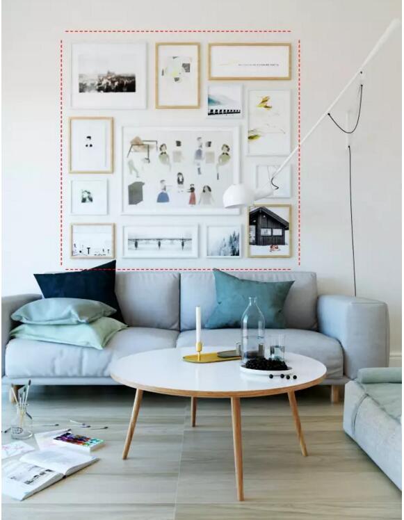均衡法:根據(jù)軟裝來決定掛畫的大小和數(shù)量,以統(tǒng)一規(guī)格平排。