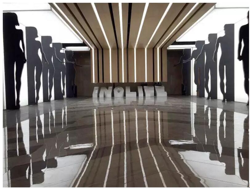 如果覺得斜落的掛畫不太新奇,那么你可以來看看這個90度翻轉(zhuǎn)的空間,用法國瑪瑙和流砂石切成不同的大小形狀來構(gòu)建一個錯視效果的空間。這種用法多用于工裝,若想要用在家裝,以點綴的形式植入較好,錯視會對人的心理和視覺有一定影響,不宜大面積出現(xiàn)和長時間觀看。