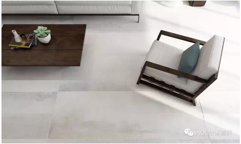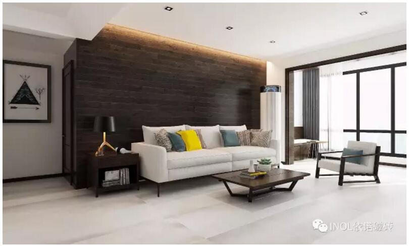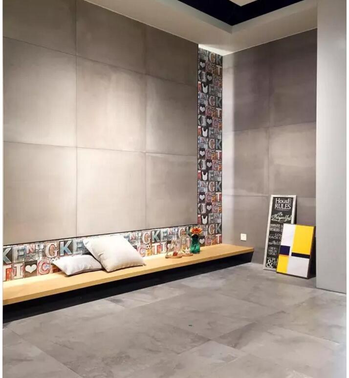 這里有個不太起眼的背景墻。嗯,看起來不起眼的東西往往可能蘊含著不同尋常。這是我們大規(guī)格的仿古產(chǎn)品漢諾石(900X900mm),大磚做背景墻的方法也是很常見了,我們需要從這個實景間看的是做電視柜的那塊擱板的木色以及上面擺設(shè)的兩個布藝抱枕,這里告訴我們沙發(fā)的選擇可以是木質(zhì)和布藝結(jié)合的沙發(fā),墻邊放著的兩幅畫則展示了若此景運用到家裝中沙發(fā)背景的掛畫風(fēng)格及顏色。