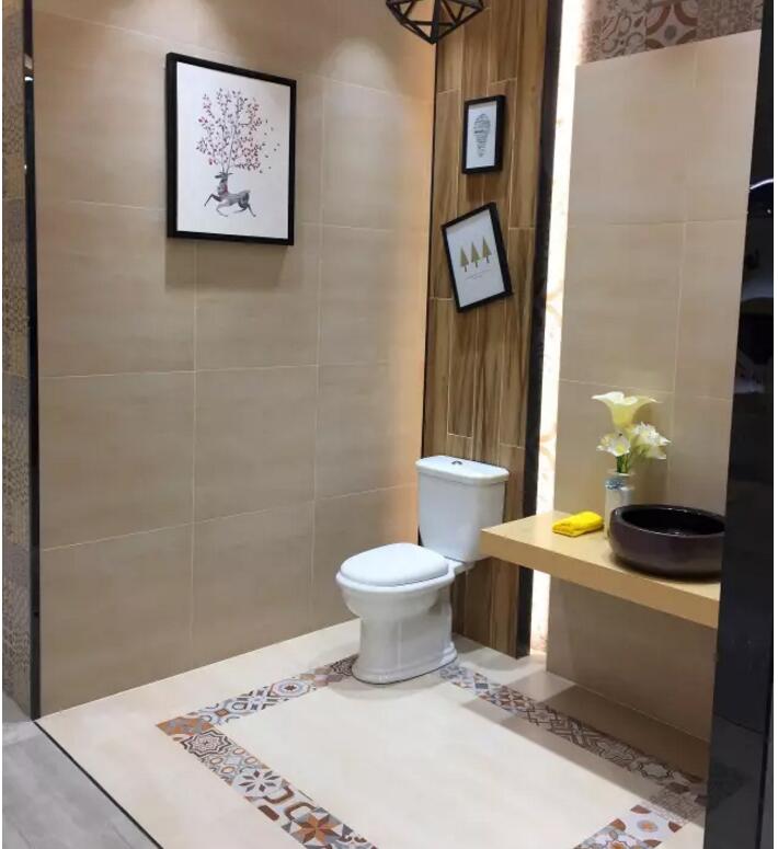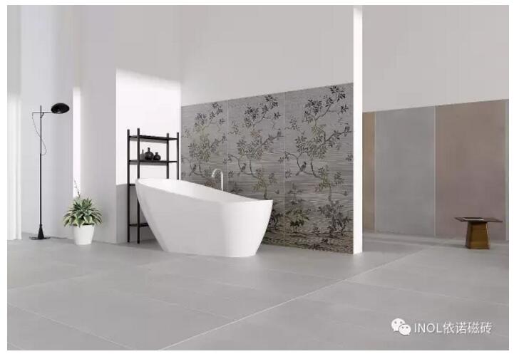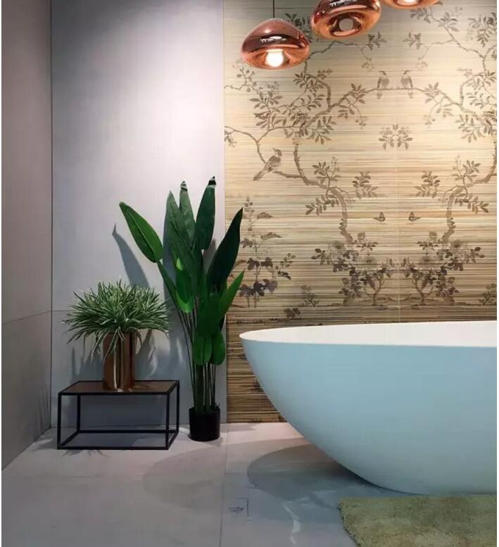 看到此景的時候,可能很多人都會覺得那個背景是一幅大型的畫作,如果你看過我們公眾號前幾期的產(chǎn)品介紹你就會知道,這是我們佛山地磚依諾大板背景墻系列——夜鶯之歌。向宋代生活和藝術(shù)致敬的巨型背景墻單片磚,擁有900X1800mm超大規(guī)格,不僅可以做背景墻還能像屏風(fēng)隔斷一樣來提升空間的美感,擁有兩個復(fù)古顏色的配磚更是讓它能夠輕松駕馭各種工裝或家裝。此前我也做過一個類似的衛(wèi)生間展示效果: