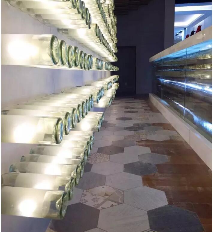 如果你走到這個角度來看,驚艷你的就不止是瓶子做的燈了,地面上六角磚和木地板的隨意銜接向你展示著一種新的鋪貼方式,我們向傳統(tǒng)木地板的“二八鋪法“致敬,同時我們對傳統(tǒng)進行創(chuàng)新,使用我們的瓷磚產(chǎn)品切割成六角形與之進行融合以創(chuàng)造一種新的鋪貼方式,家裝推薦使用在玄關(guān)、衣帽間、陽臺、吧臺地面、亦可上墻做電視背景或者沙發(fā)背景。