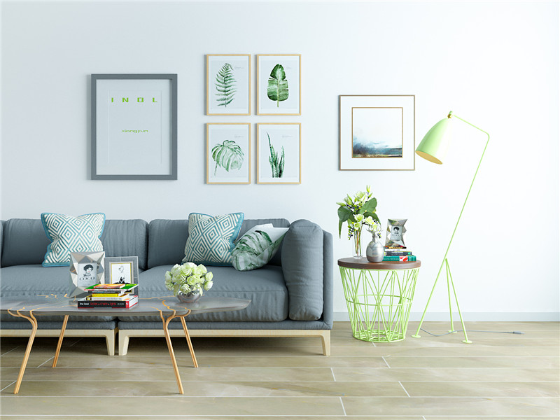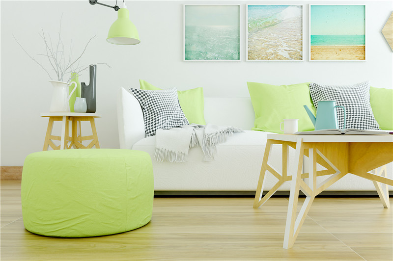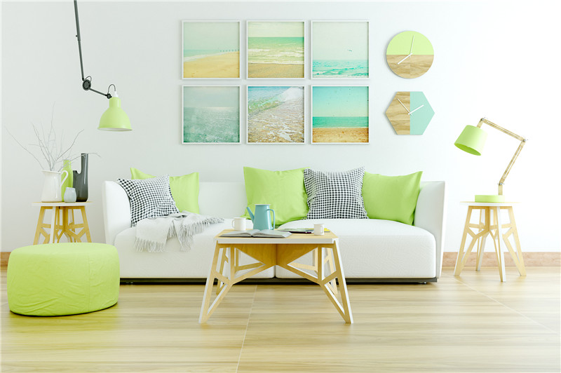 在抱枕、坐墊或者臺燈裝飾物等容易更換的物件上選用主色“草木綠”,再以暖色的實(shí)木來互補(bǔ),掛畫選擇與主色類似的色調(diào),通過白墻來加以強(qiáng)調(diào)。