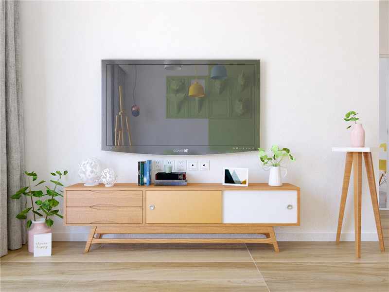 電視背景墻部分若想要清新的白墻又怕變成慘白,可選擇暖色系的實(shí)木電視柜,再點(diǎn)綴幾株小而精致的綠植,豐富白色單調(diào)的墻面。