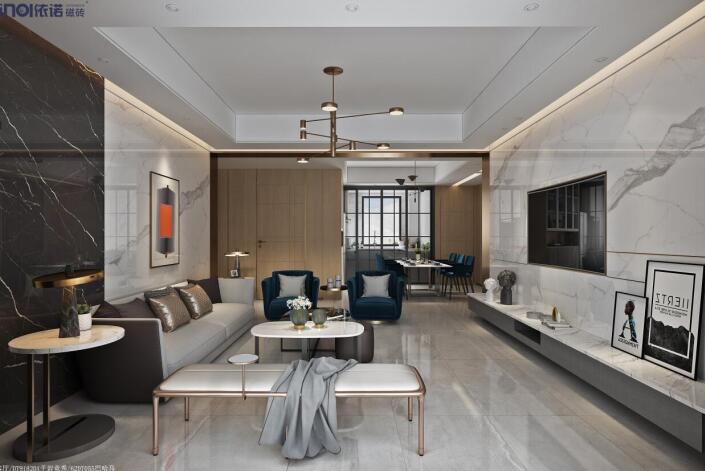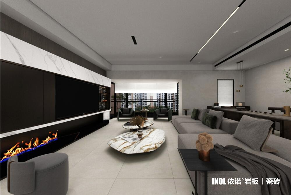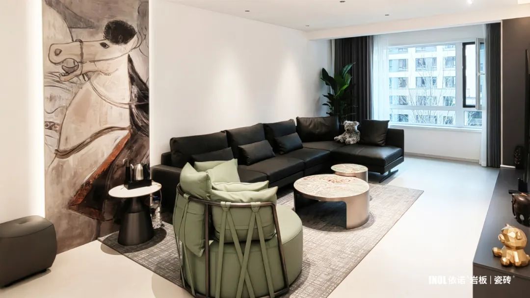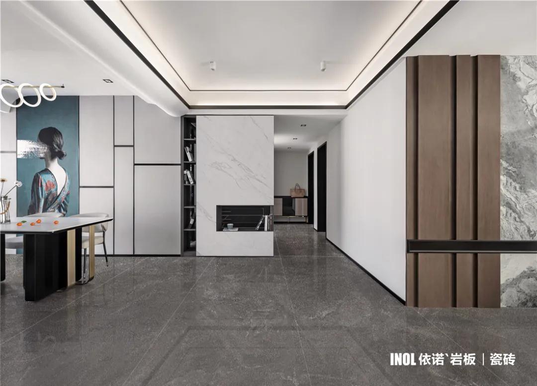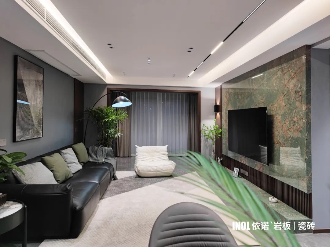 依諾瓷磚【老友記】案例,黑白灰系列125㎡輕奢極簡(jiǎn)風(fēng),全屋選用依諾通體大理石瓷磚和巖板背景墻【亞馬遜翡翠綠】,冷暖色調(diào)的適用,帶來自然舒適的居住體驗(yàn)。