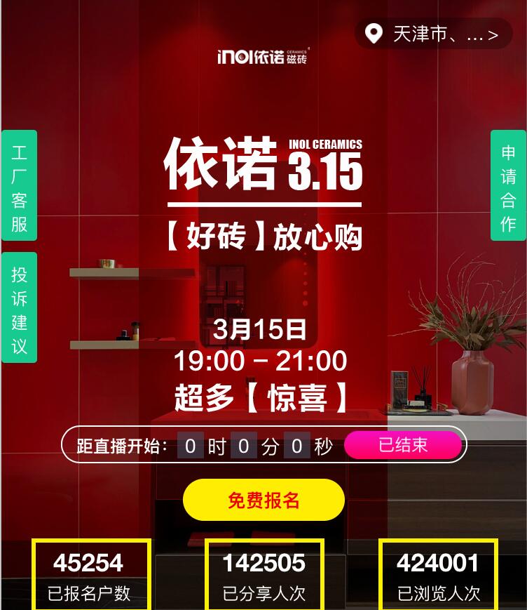 2016年3月27日,依諾磁磚爆破營(yíng)銷活動(dòng)在武漢、襄陽(yáng)、鄭州、徐州、上海、樂山、重慶、瀘西縣、大連、沈陽(yáng)、唐山、天津12個(gè)城市落下帷幕,活動(dòng)最終以1天1764單的非凡業(yè)績(jī),向行業(yè)彰顯了依諾磁磚的品牌魅力和影響力。