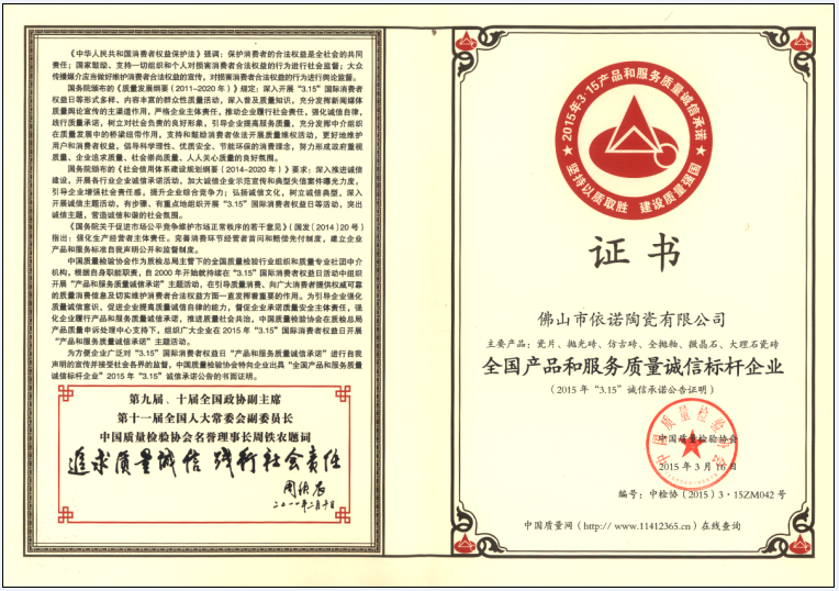 在2015年“3.15”國(guó)際消費(fèi)者權(quán)益日“產(chǎn)品和服務(wù)質(zhì)量誠(chéng)信承諾”中,經(jīng)國(guó)家質(zhì)檢總局、中國(guó)質(zhì)量檢驗(yàn)協(xié)會(huì)的全面鑒定,依諾磁磚從上千家企業(yè)中脫穎而出,榮獲“全國(guó)產(chǎn)品和服務(wù)質(zhì)量誠(chéng)信標(biāo)桿企業(yè)”!這是繼2014年“3.15”國(guó)際消費(fèi)者權(quán)益日依諾磁磚榮獲 “全國(guó)質(zhì)量和服務(wù)誠(chéng)信優(yōu)秀企業(yè)”之后的又一殊榮。據(jù)了解,陶瓷行業(yè)獲得本項(xiàng)殊榮的還有東鵬、唯美、簡(jiǎn)一等知名企業(yè)。